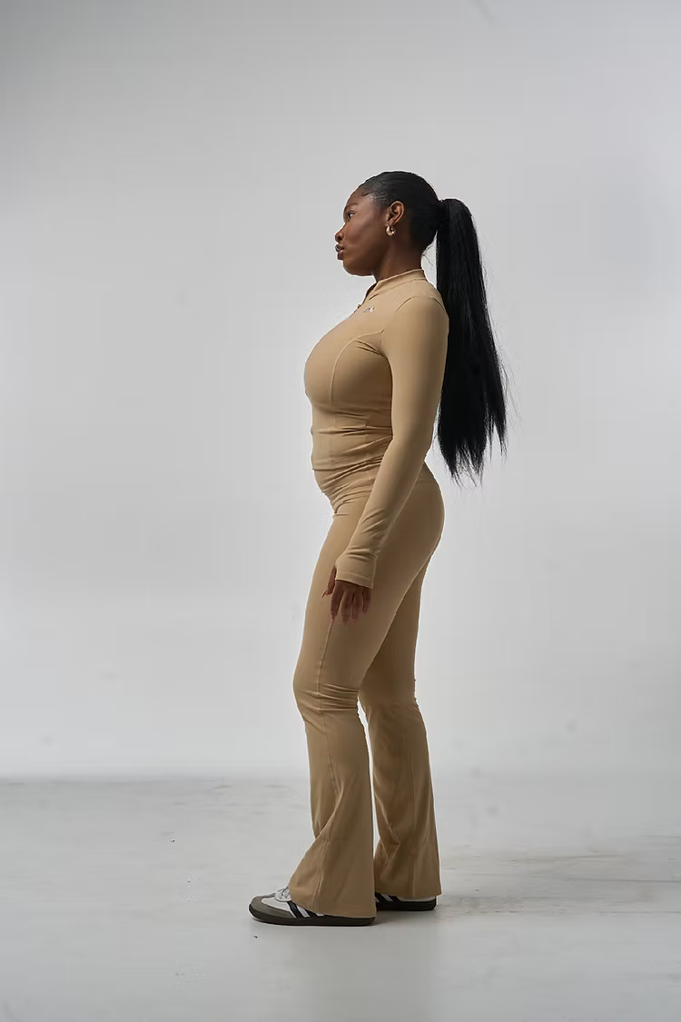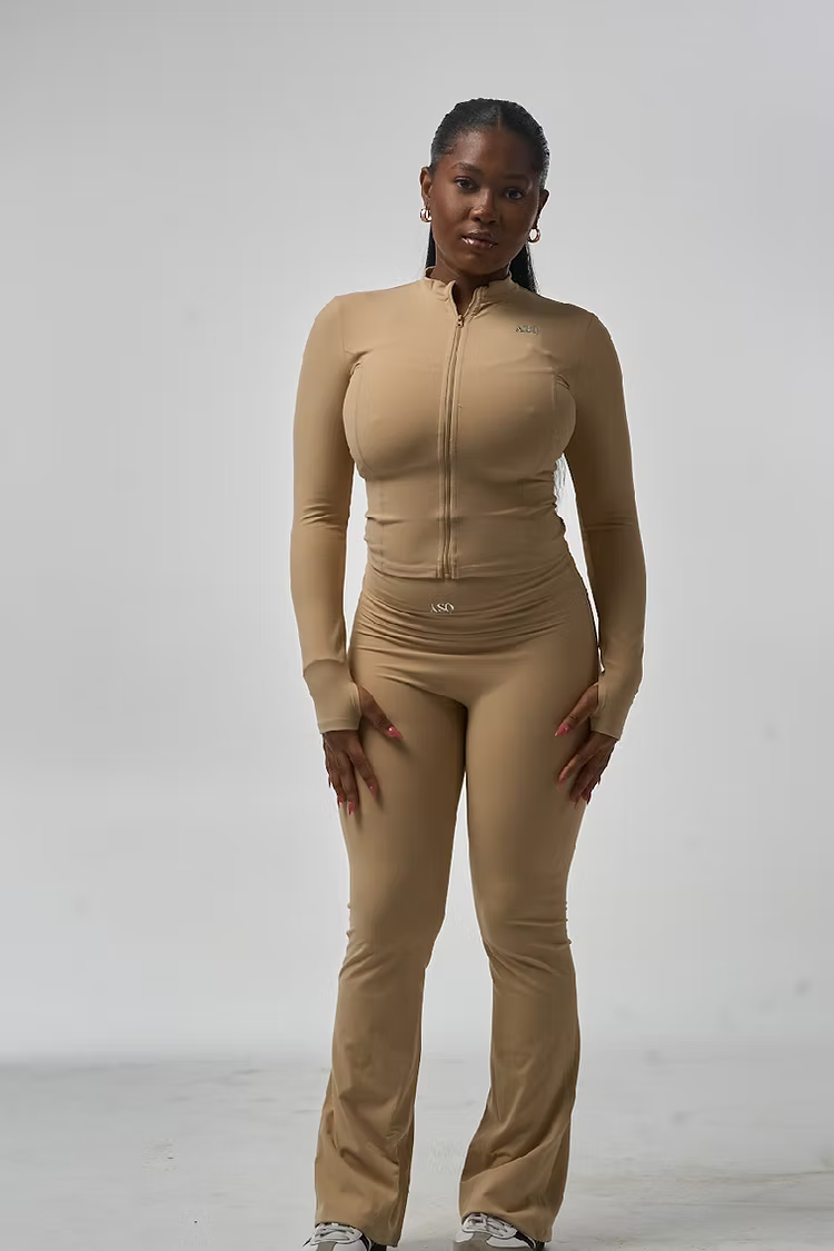 Sophisticated, sleek, and made to move with you. The Coffee Claire Set features a fitted zip-up top and flared bottoms that combine comfort with confidence. Perfect for workouts, errands, or dressing it up for a chic streetwear look this set is your new everyday essential with a bold twist.